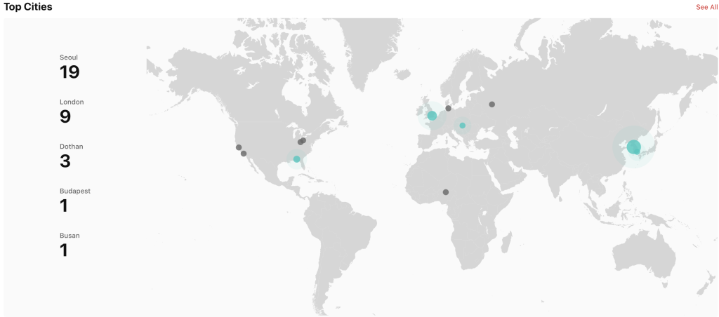 This is from Apple Music, showing the top songs of mine and where they were played on the platform. I don’t know how it compares to Spotify or Pandora or any of the other platforms – but Apple music is the only one that gives me charts like this.